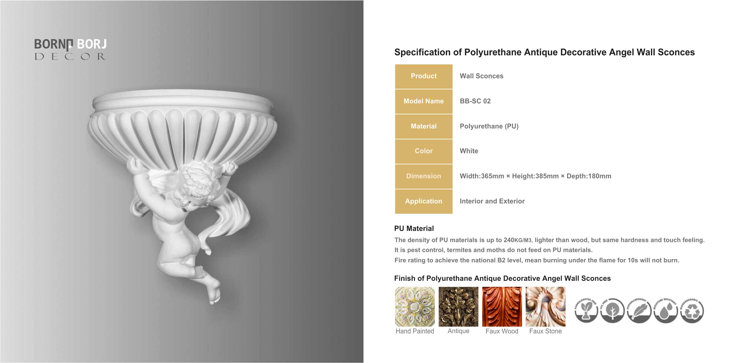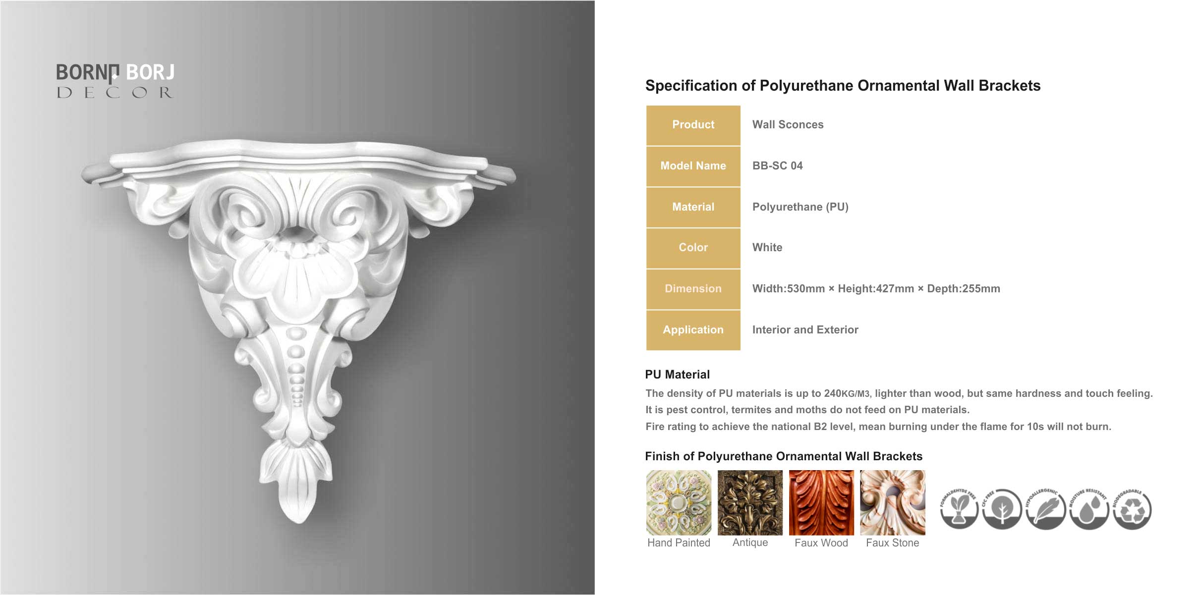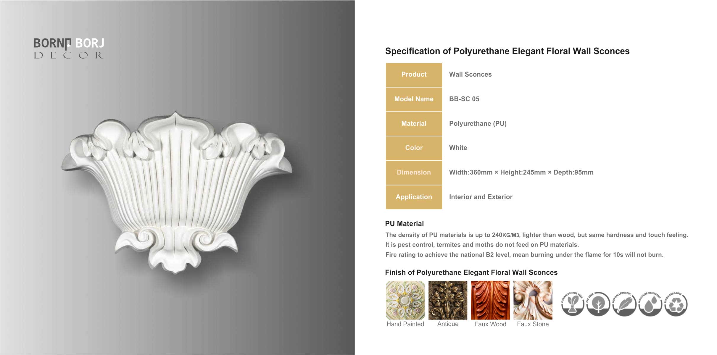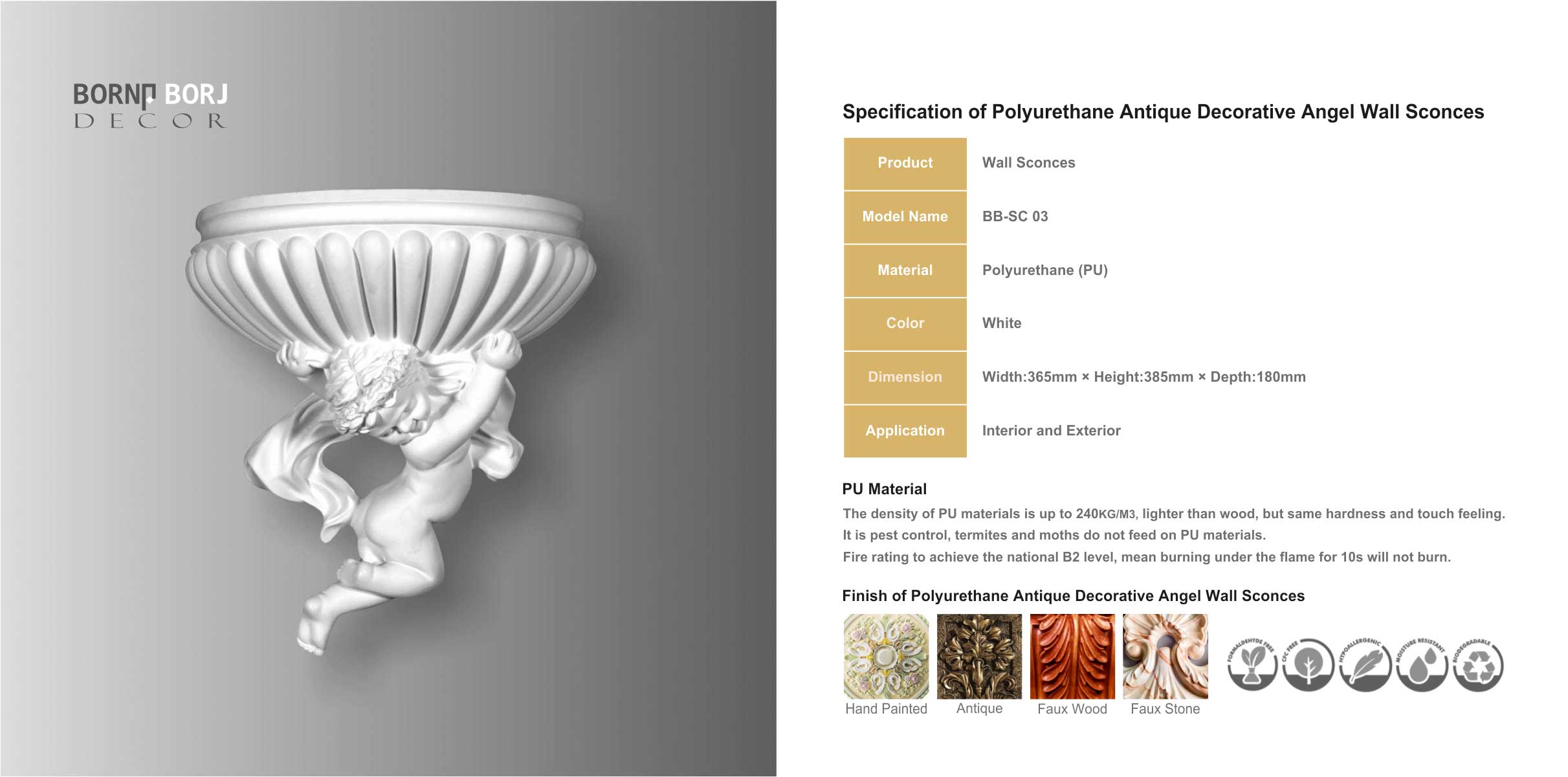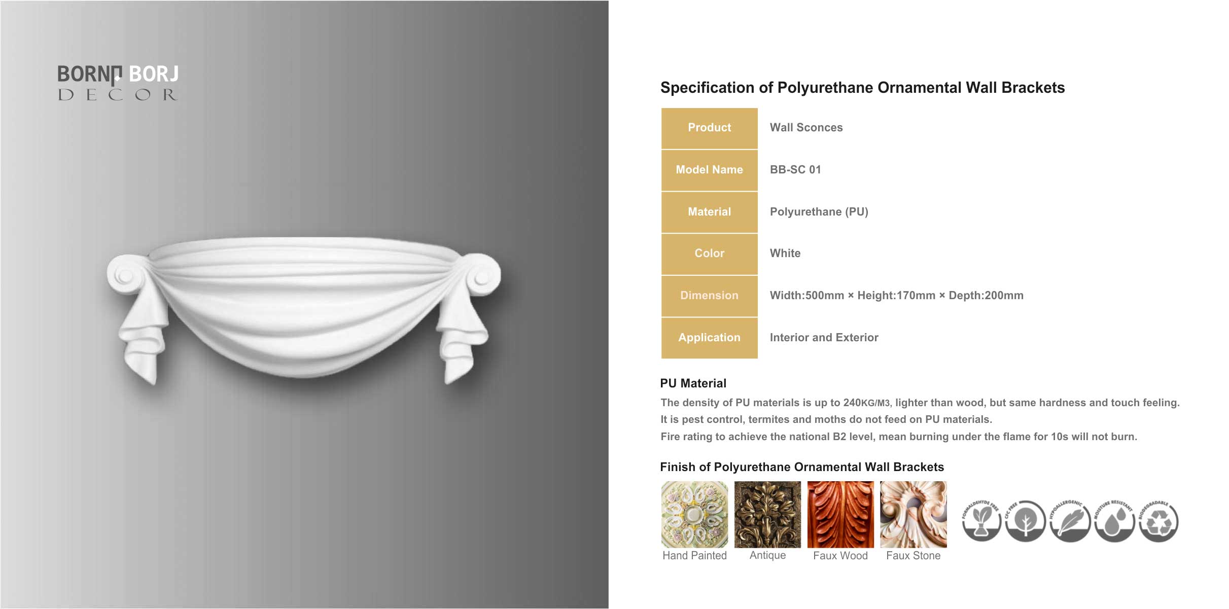 دیوارکوب پلی یورتان دکوراتیو آماده با دانسیته و کیفیت بسیار بالا تولید می شوند و در انواع طرح های کلاسیک مانند دیوارکوب های طرح فرشته چپ و راست، دیوارکوب نیم کره با امکان تعبیه لامپ توسط شرکت برنا برج تولید می گردد.