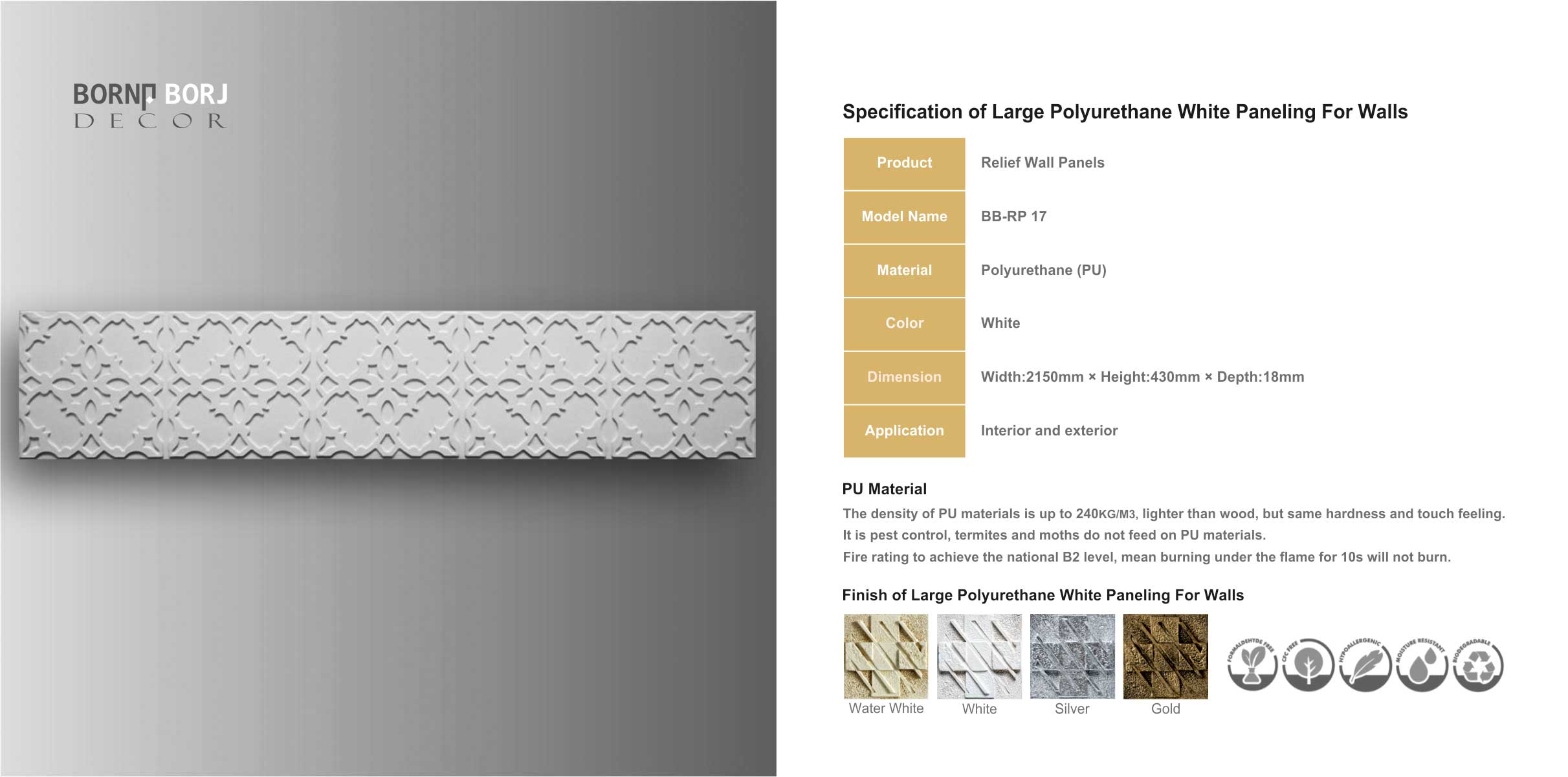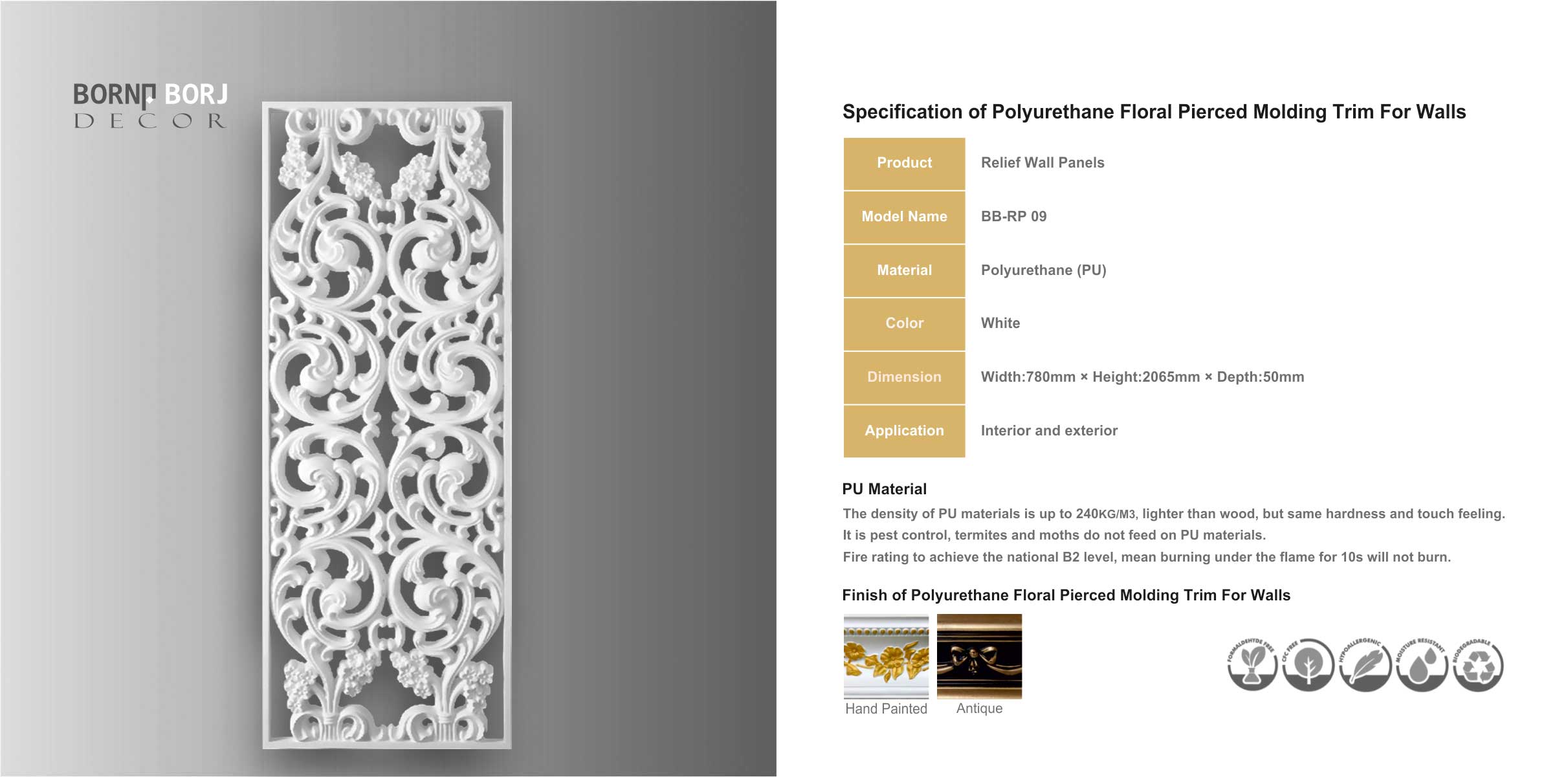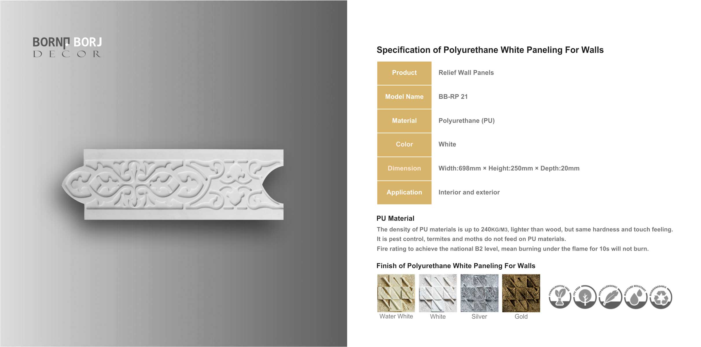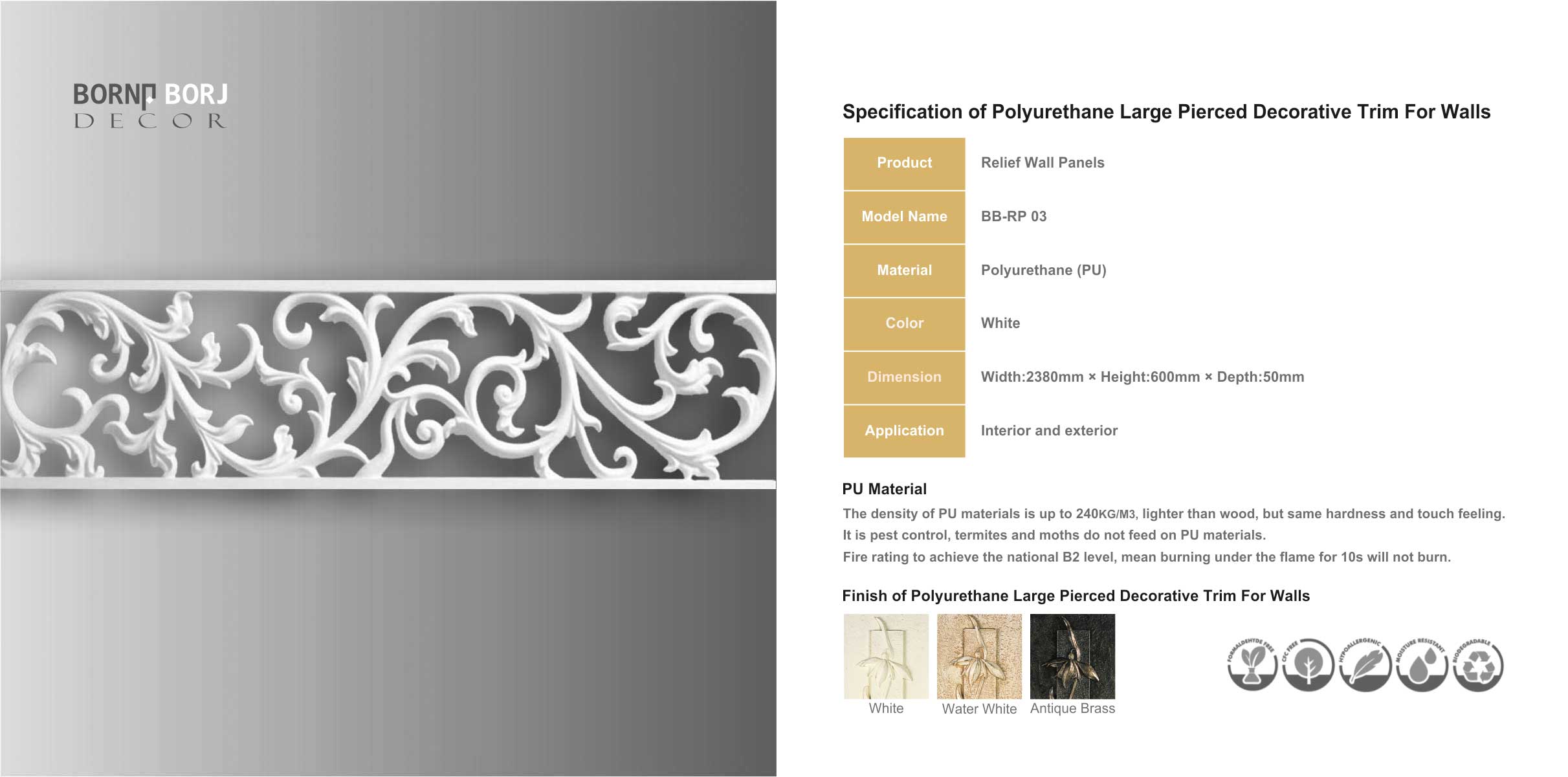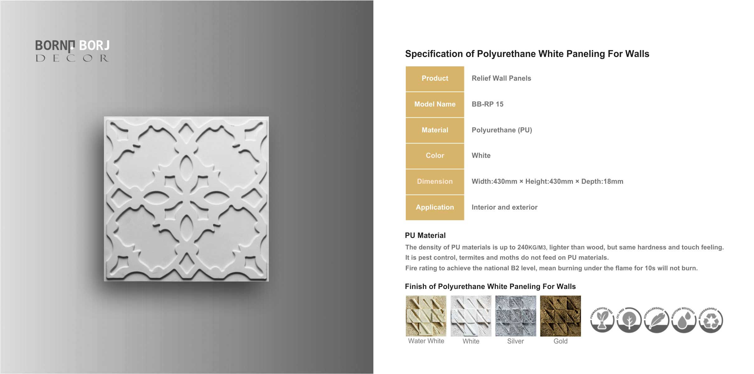 پانل برجسته دکوراتیو پلی یورتان مجموعه منظم و از پیش طراحی شده از انواع نقوش برجسته و گلبرگ های زیبا یا اشکال هندسی سه بعدی در کنار یکدیگر است.