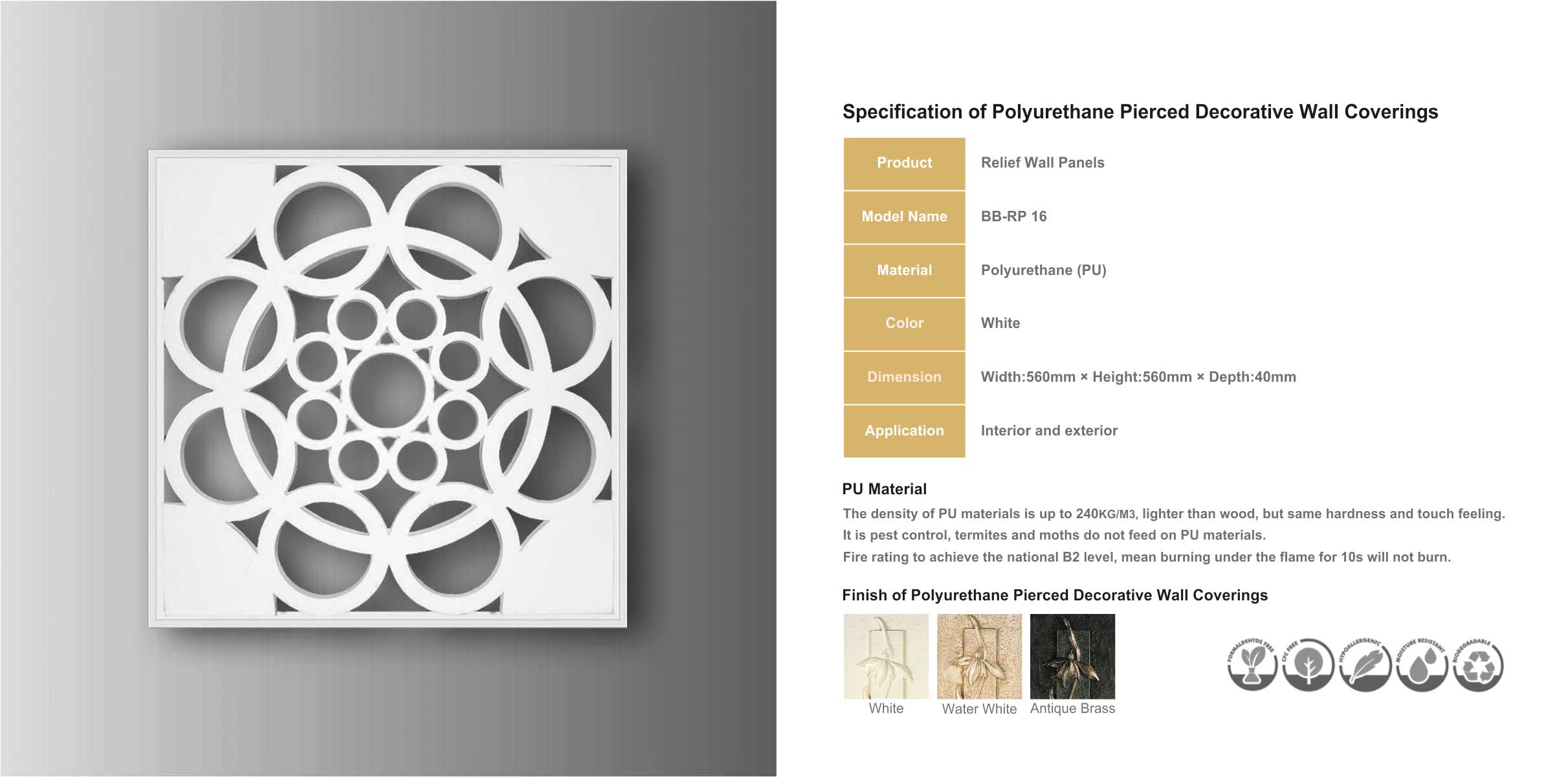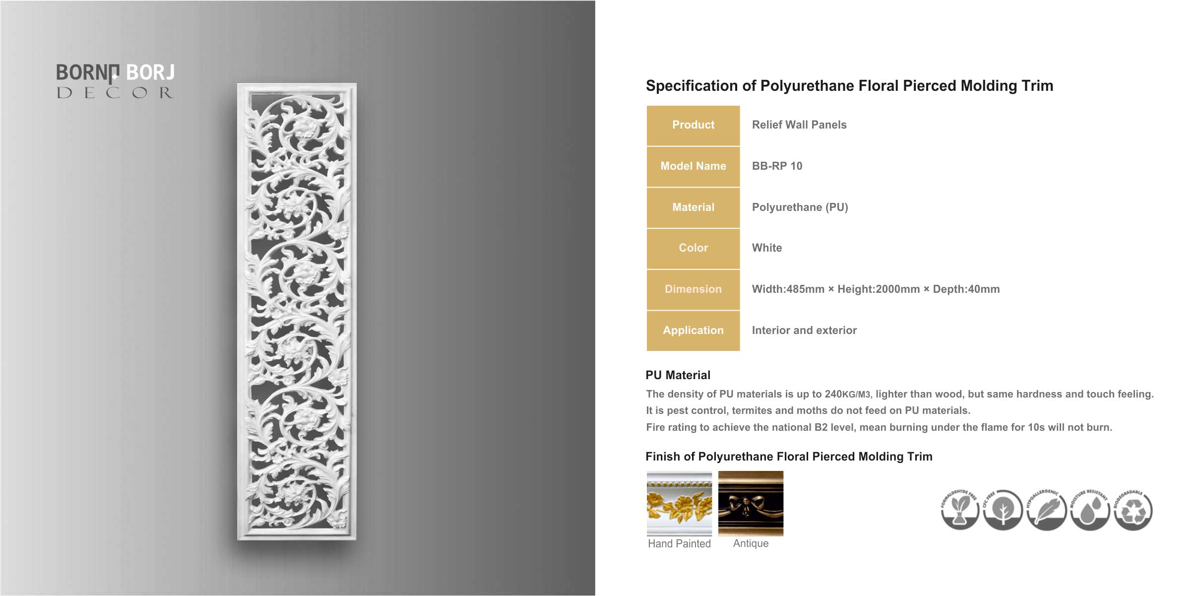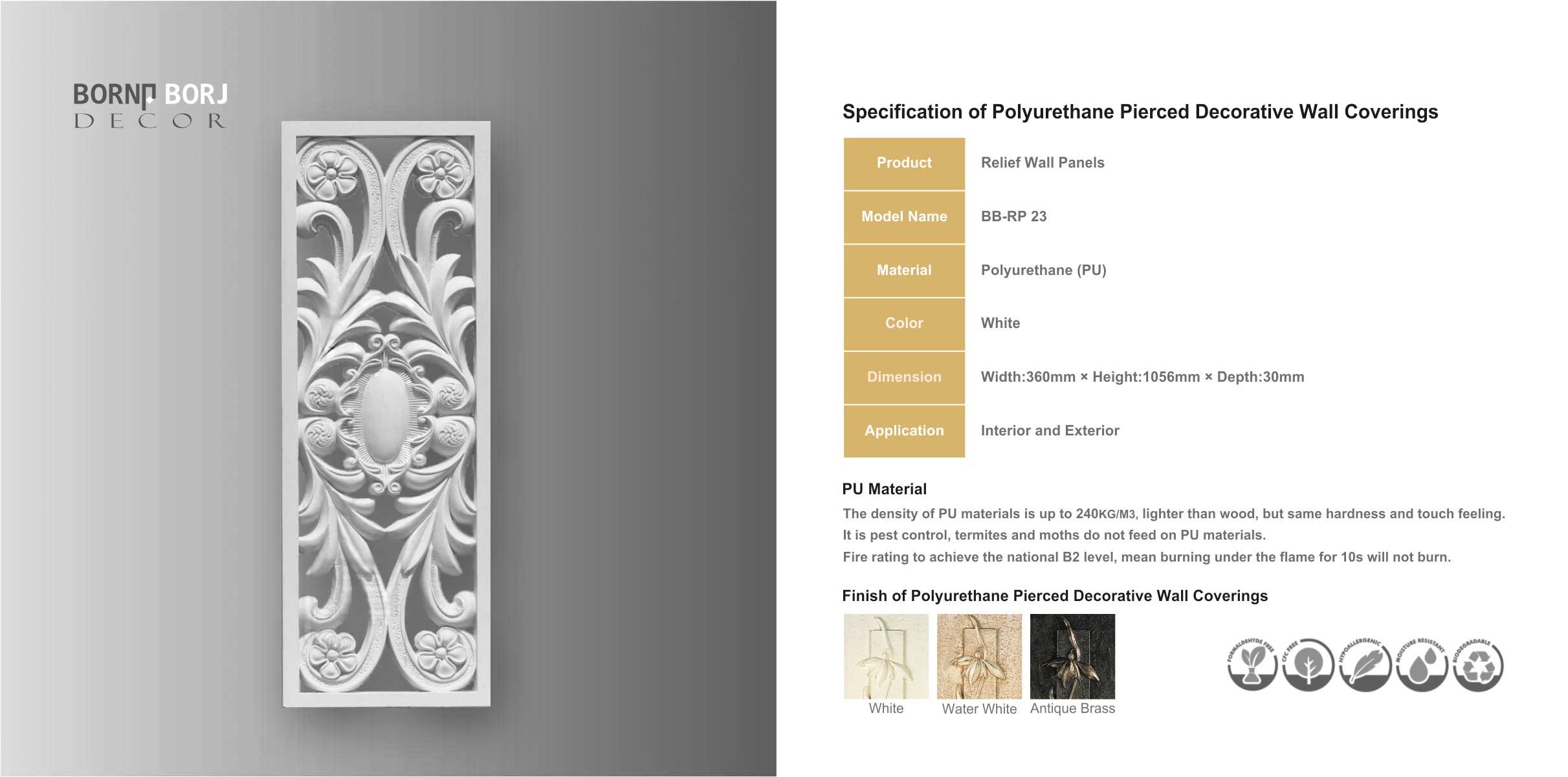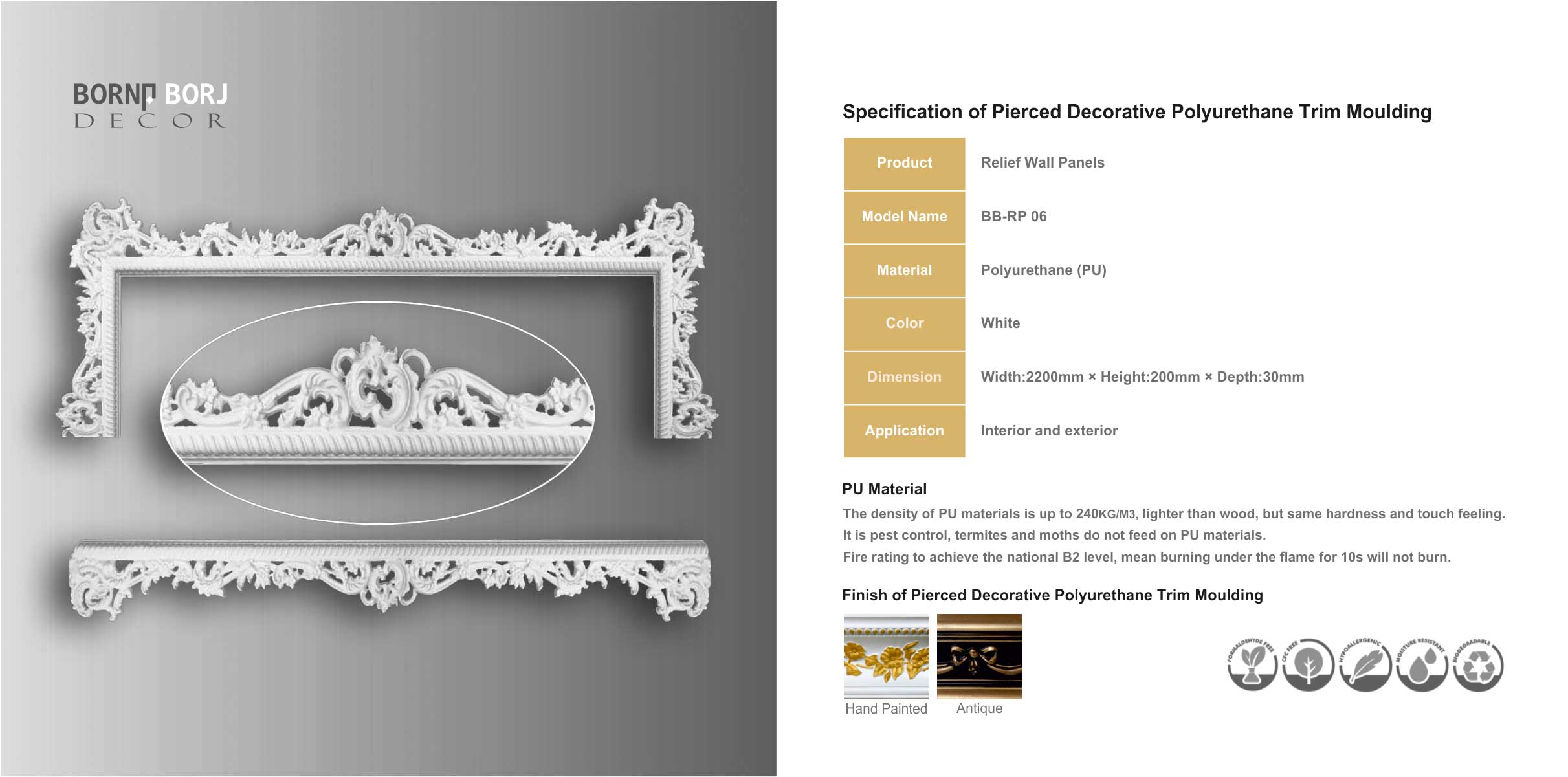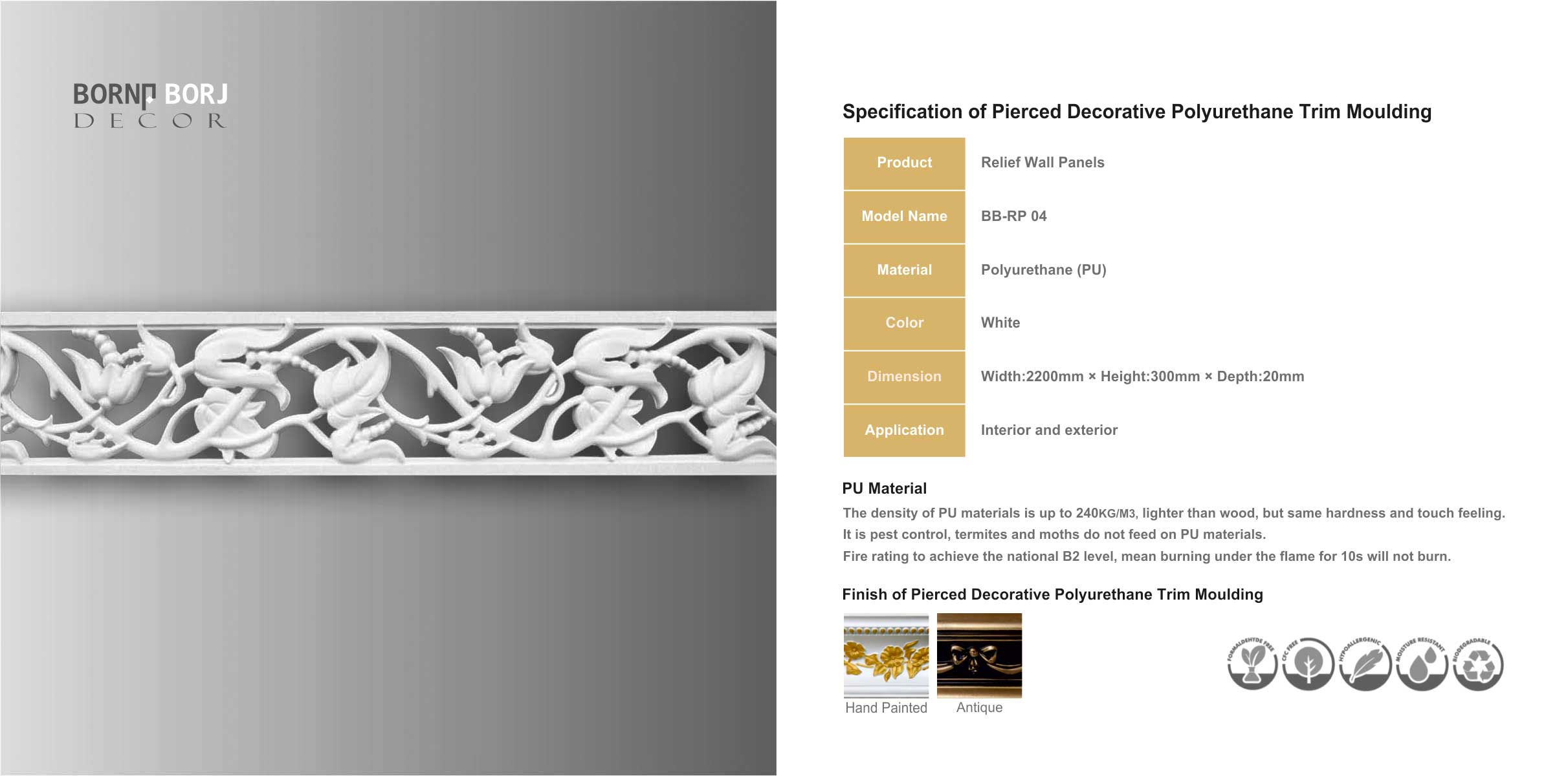 پانل برجسته دکوراتیو پلی یورتان مجموعه منظم و از پیش طراحی شده از انواع نقوش برجسته و گلبرگ های زیبا یا اشکال هندسی سه بعدی در کنار یکدیگر است.