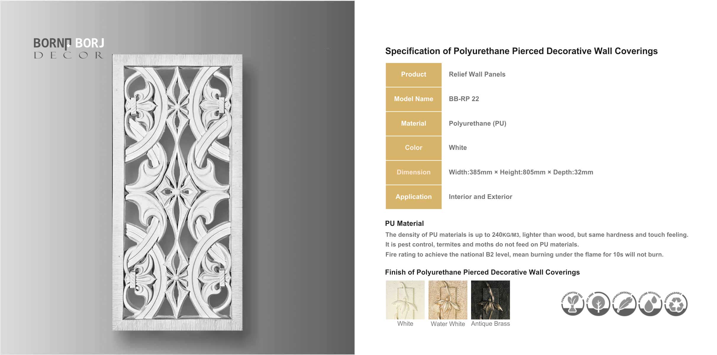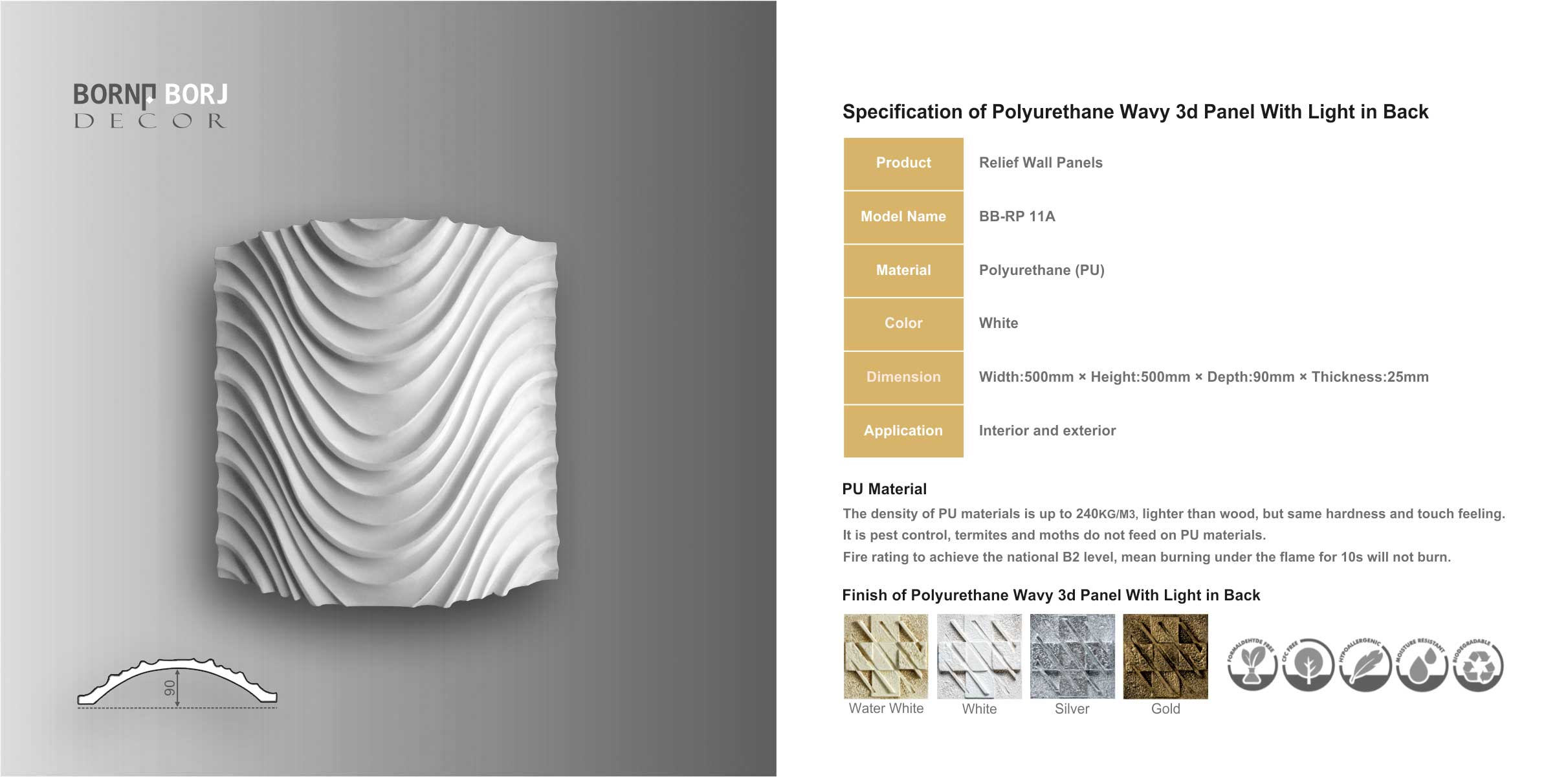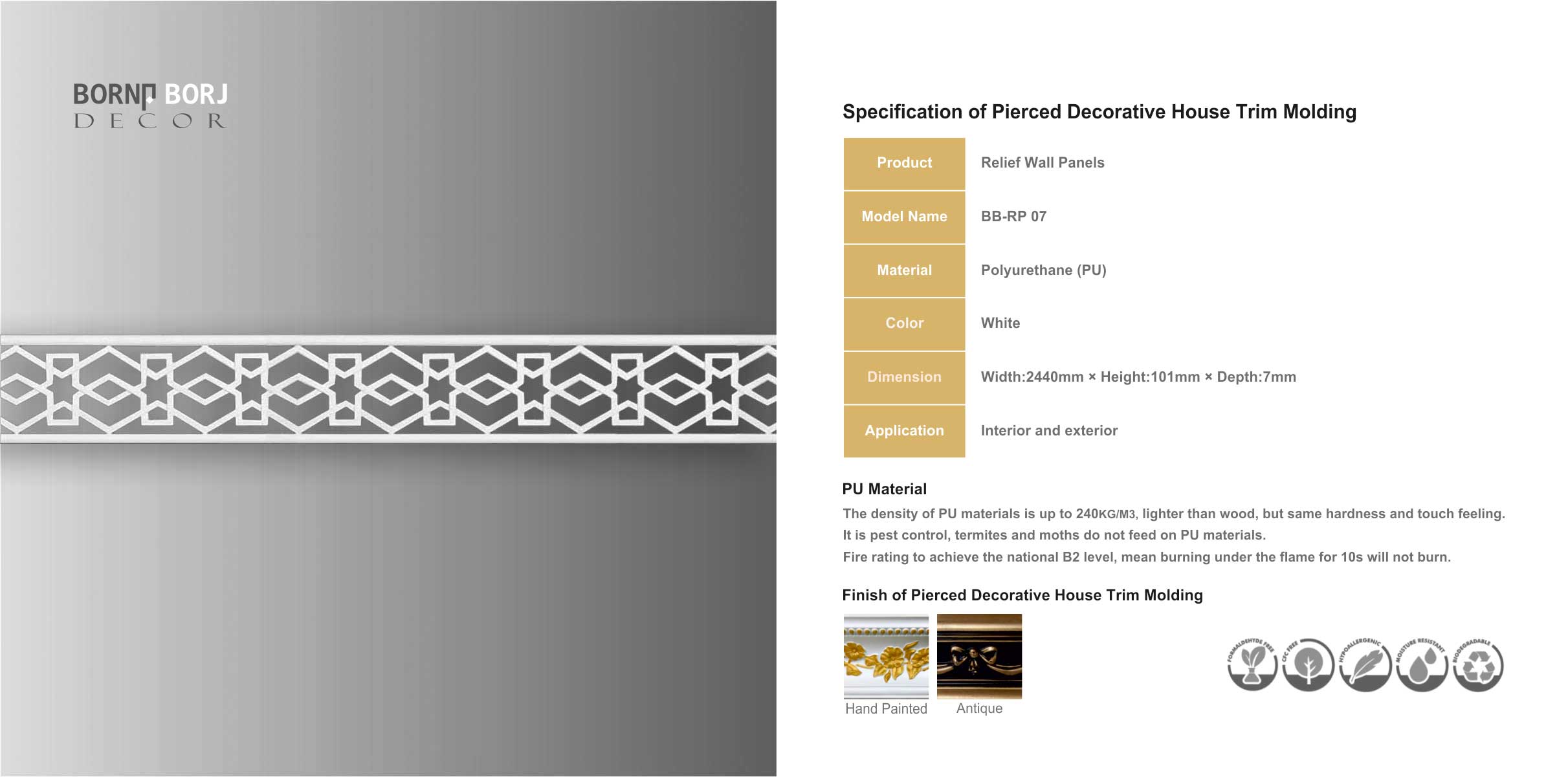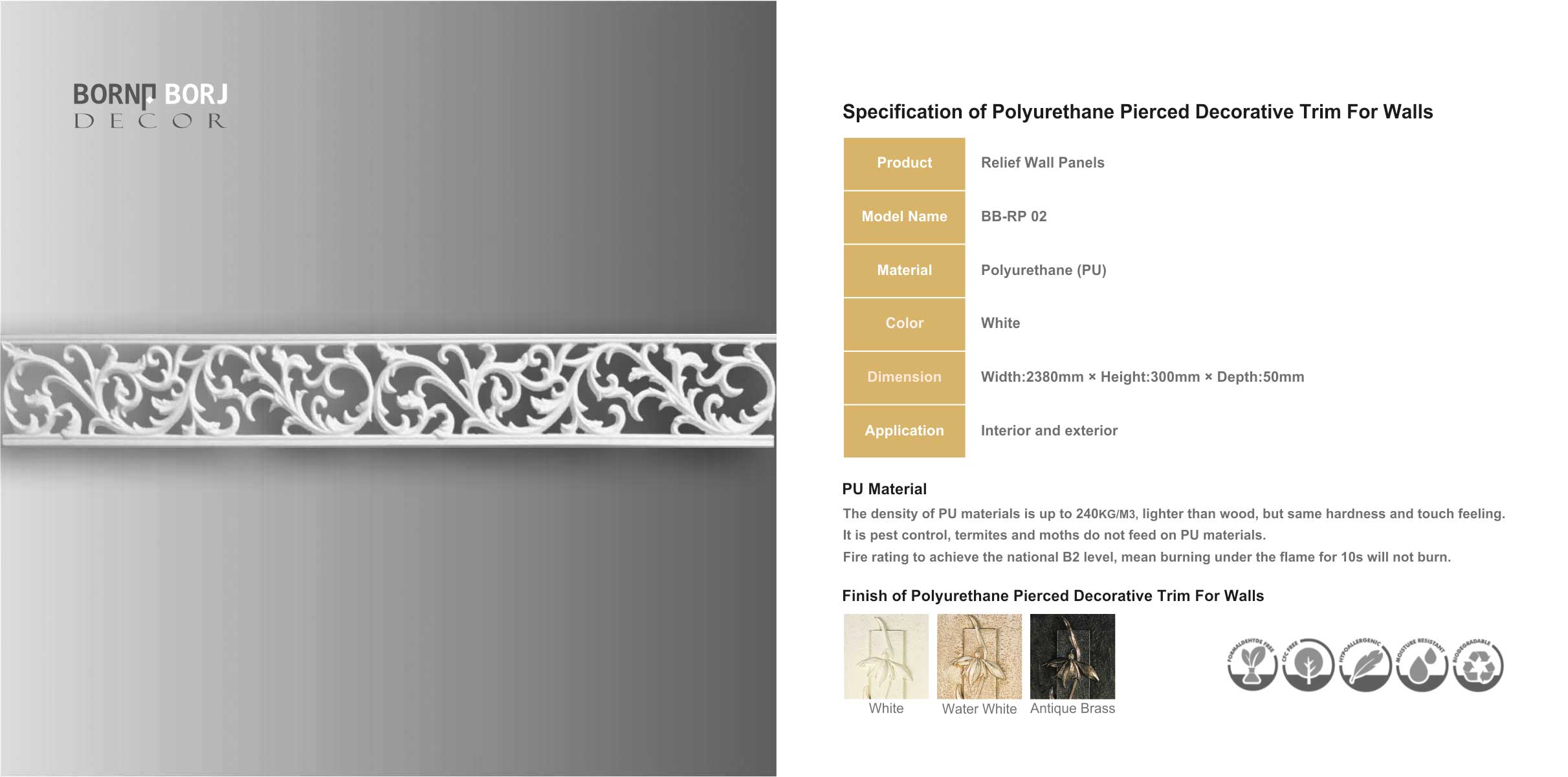 پانل برجسته دکوراتیو پلی یورتان مجموعه منظم و از پیش طراحی شده از انواع نقوش برجسته و گلبرگ های زیبا یا اشکال هندسی سه بعدی در کنار یکدیگر است.
