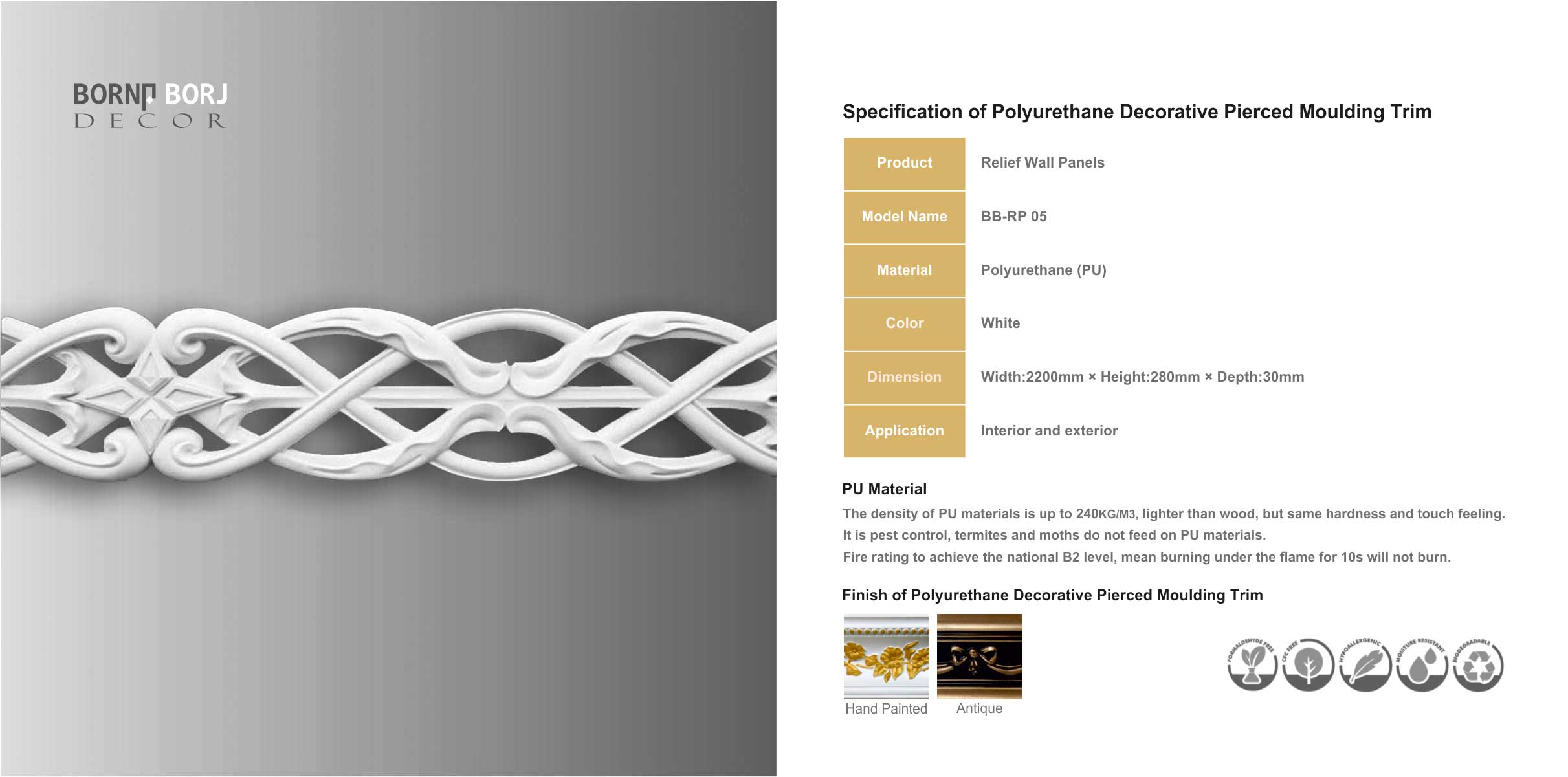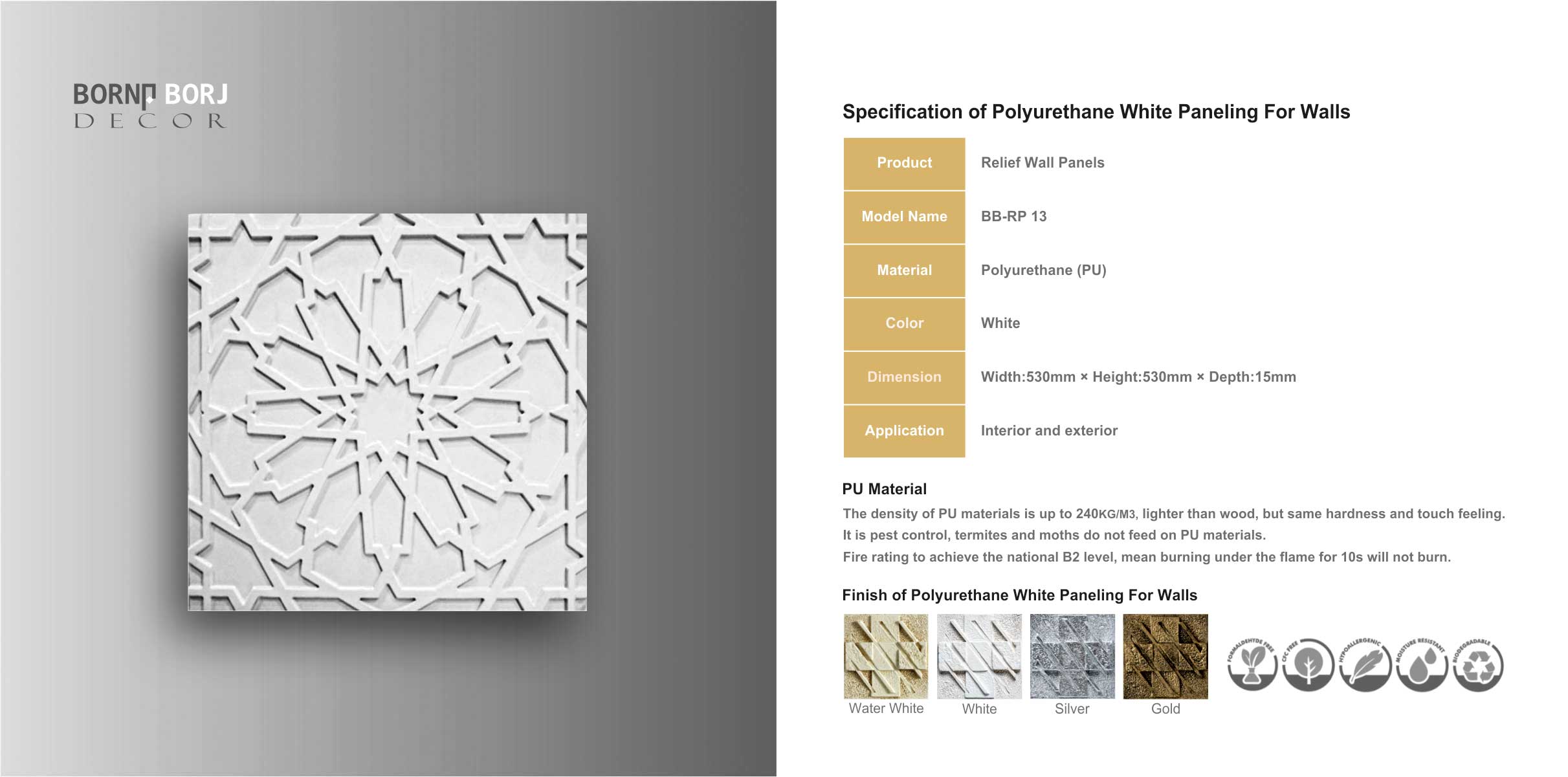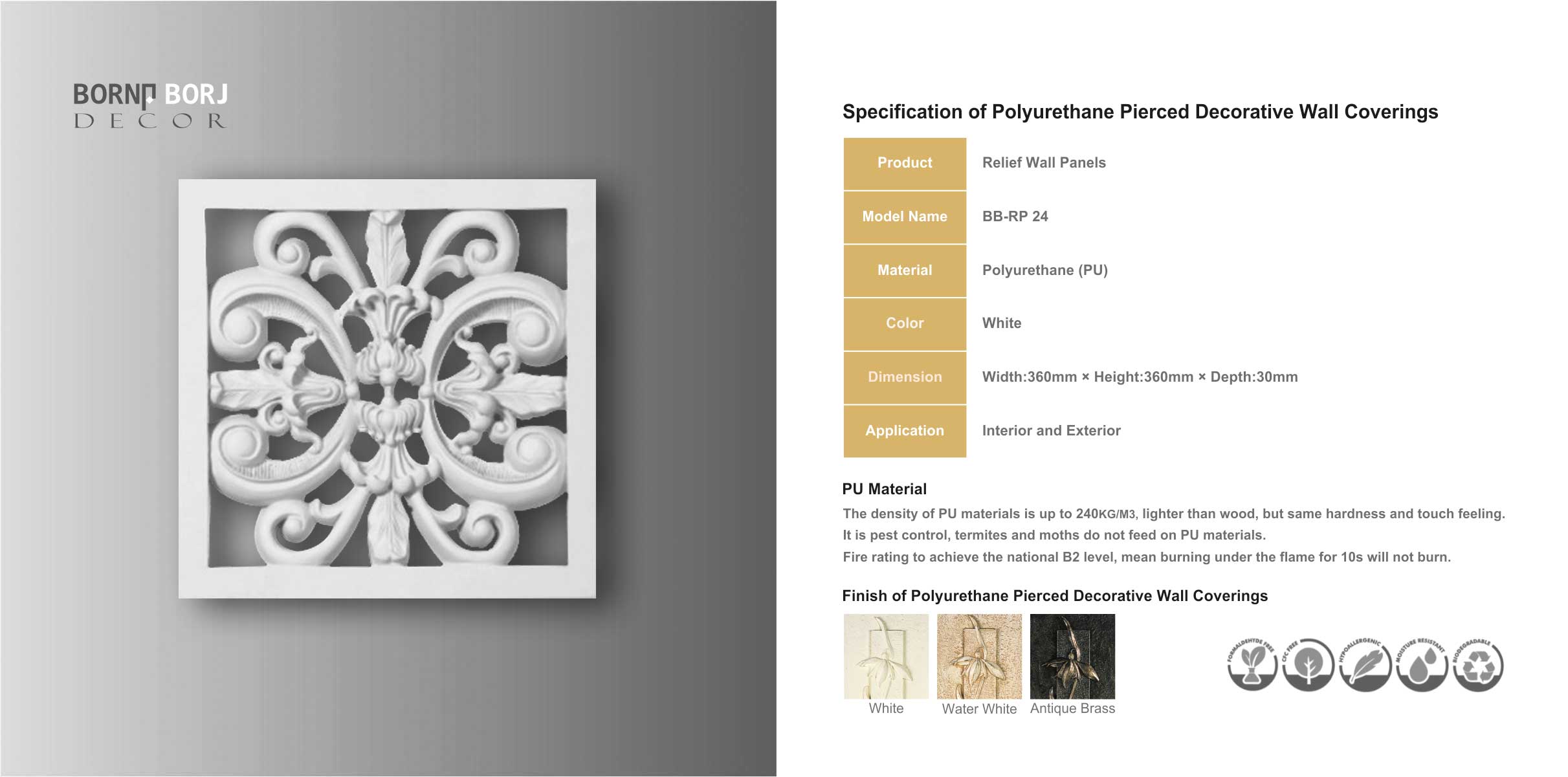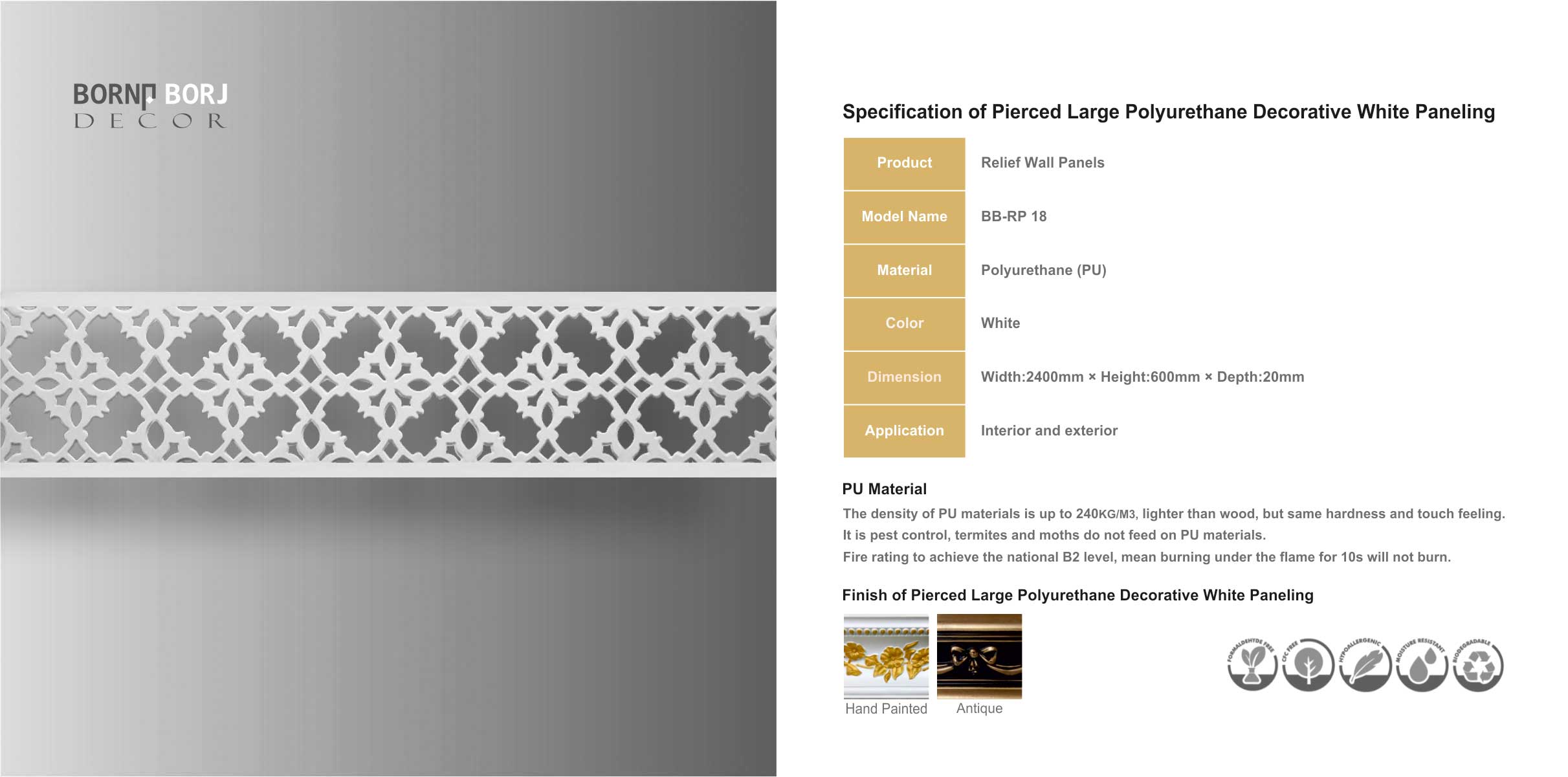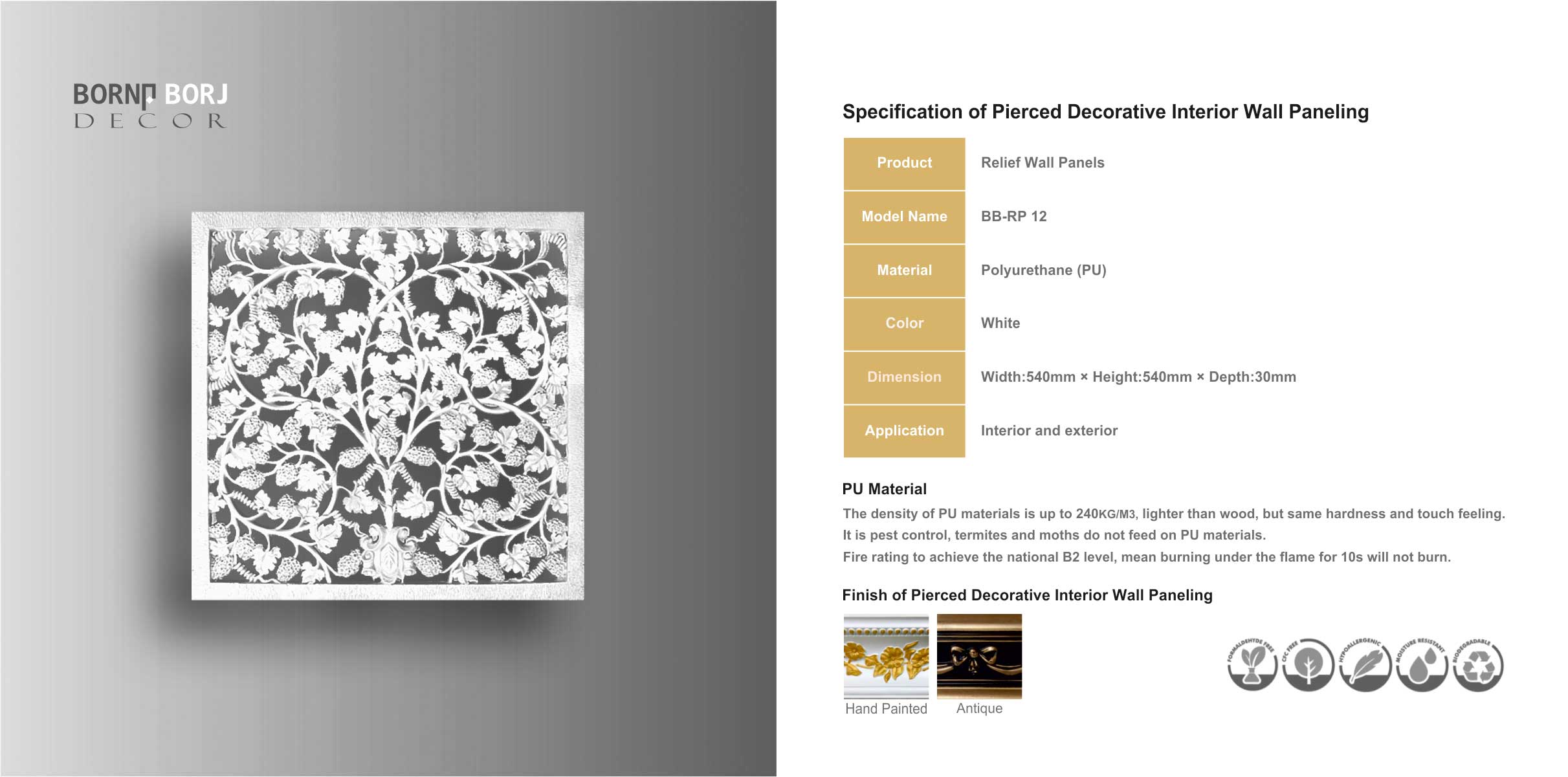 پانل برجسته دکوراتیو پلی یورتان مجموعه منظم و از پیش طراحی شده از انواع نقوش برجسته و گلبرگ های زیبا یا اشکال هندسی سه بعدی در کنار یکدیگر است.