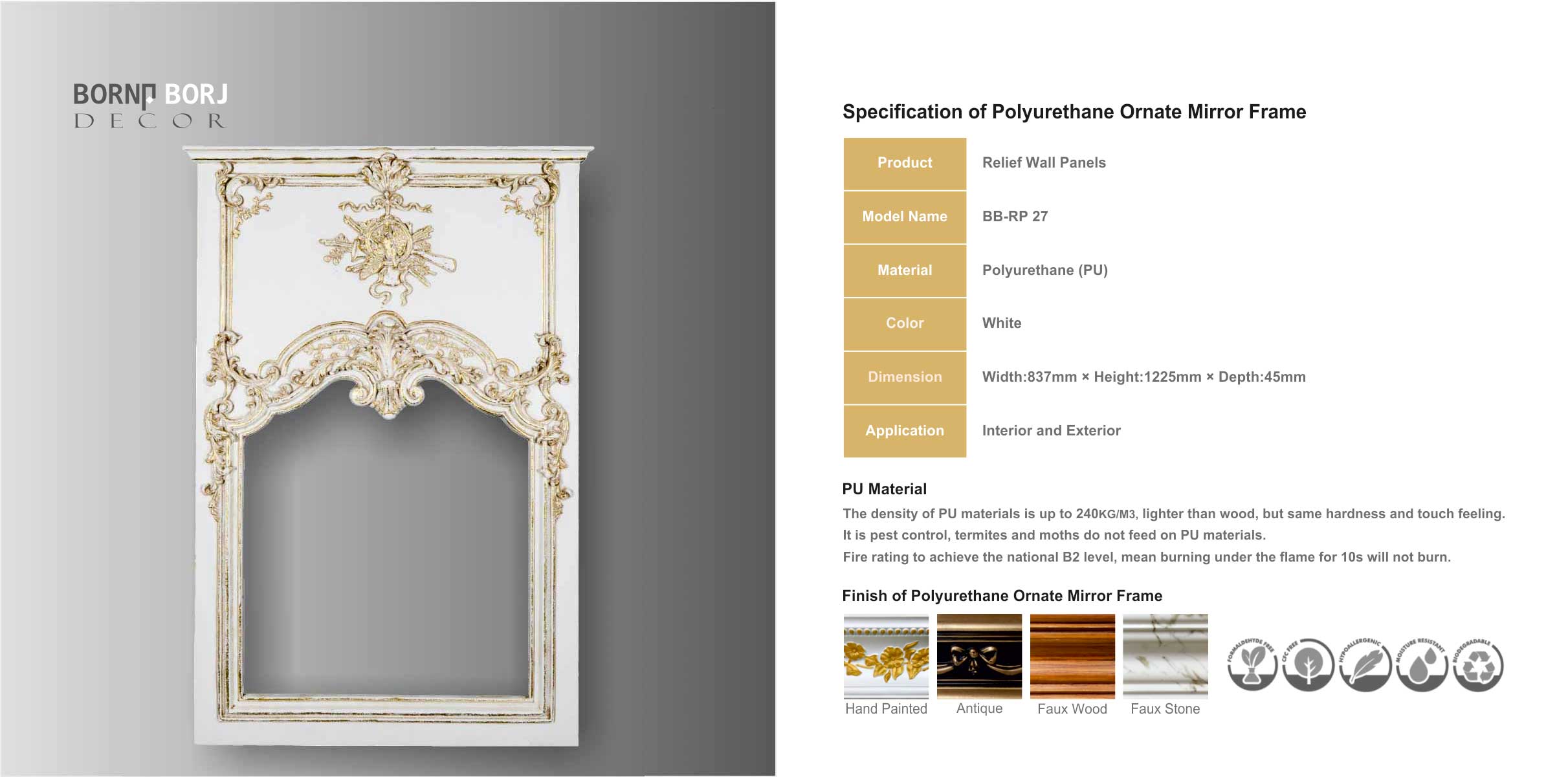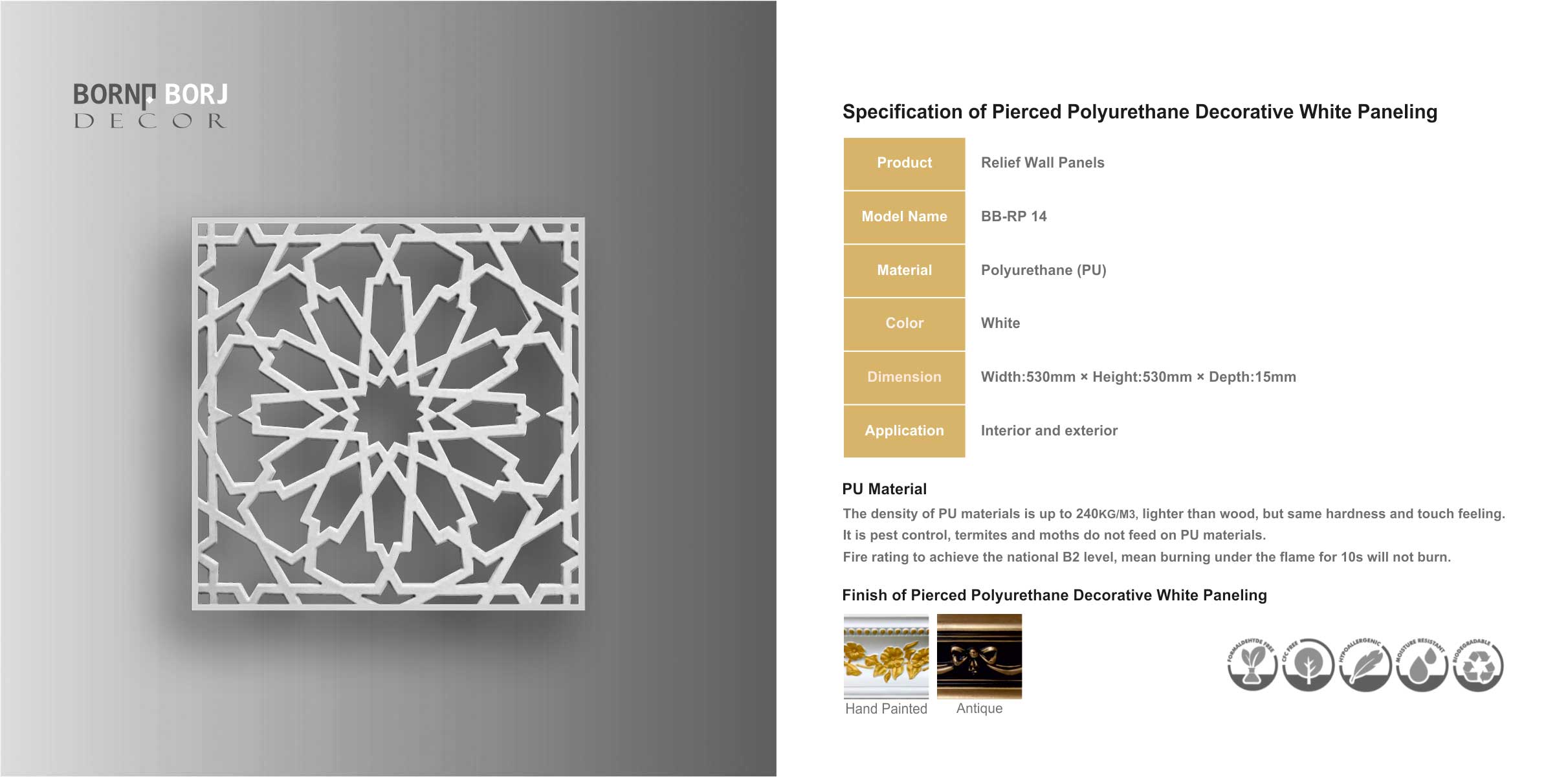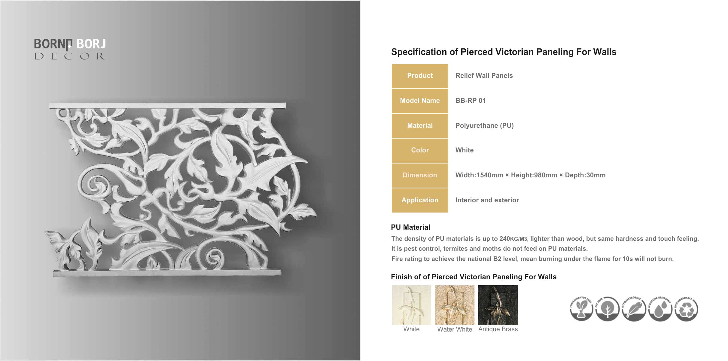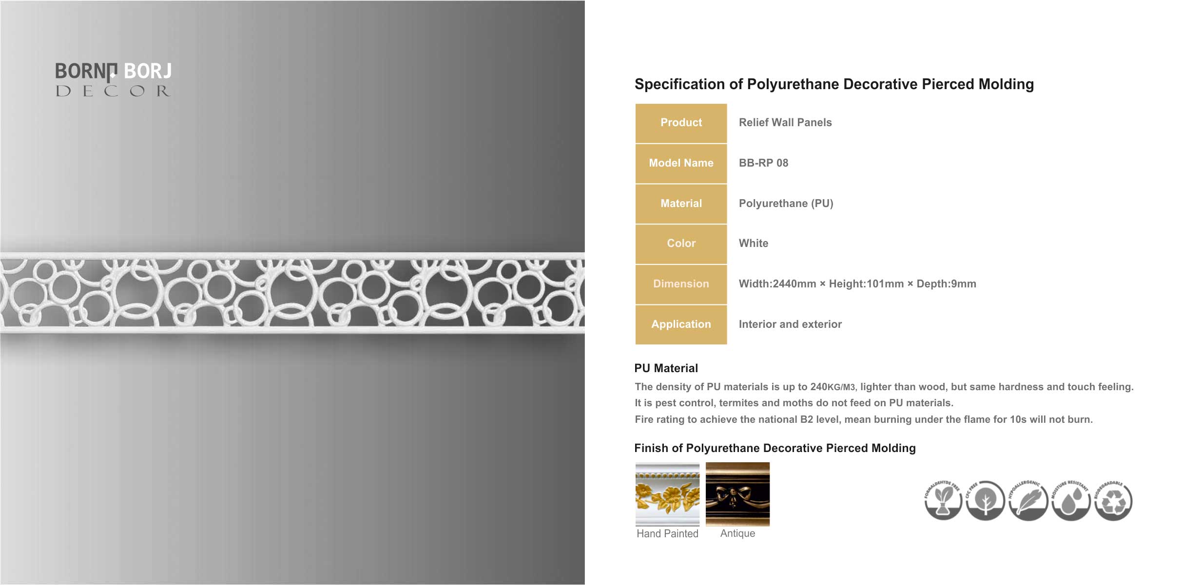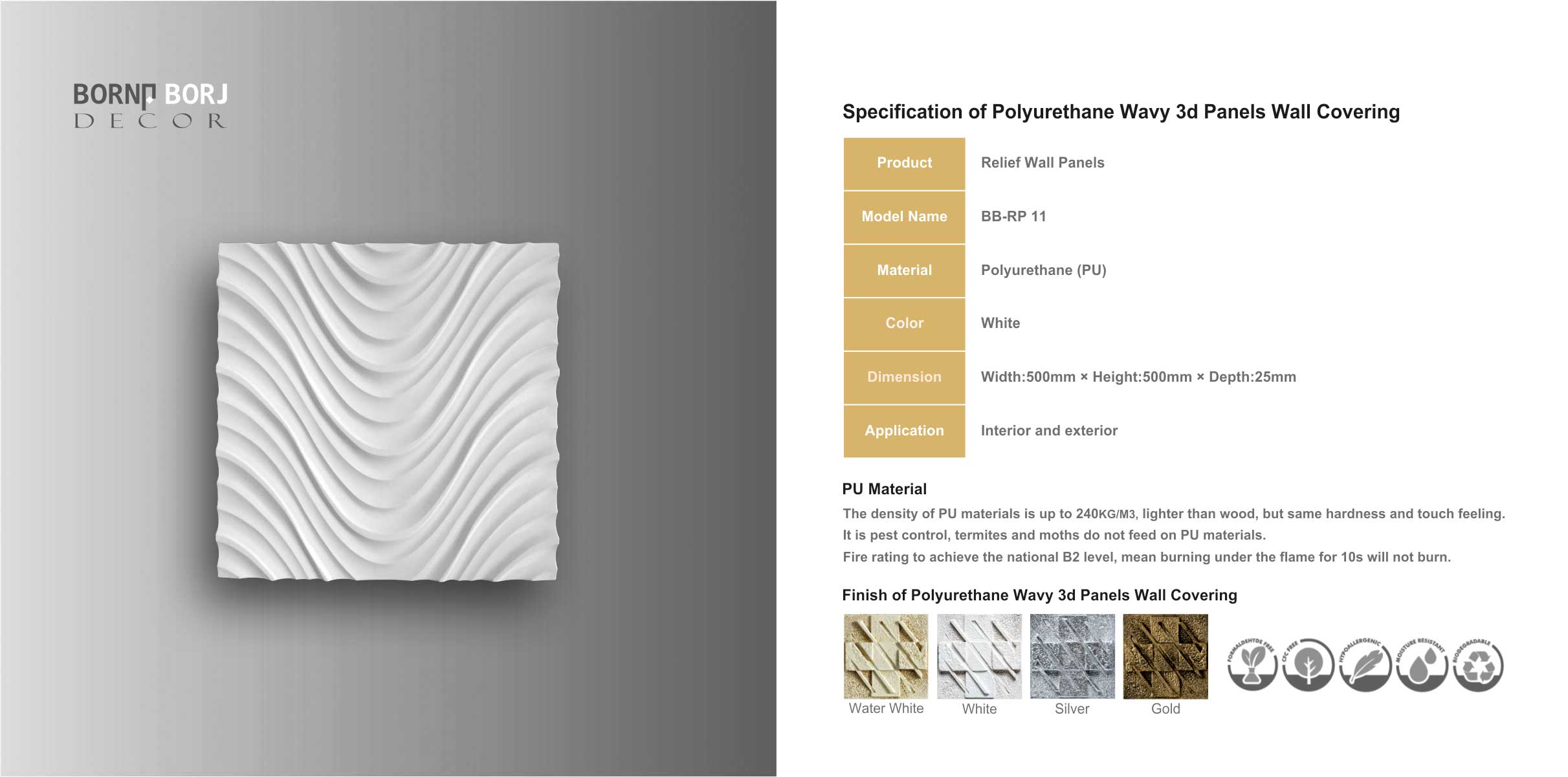 پانل برجسته دکوراتیو پلی یورتان مجموعه منظم و از پیش طراحی شده از انواع نقوش برجسته و گلبرگ های زیبا یا اشکال هندسی سه بعدی در کنار یکدیگر است.