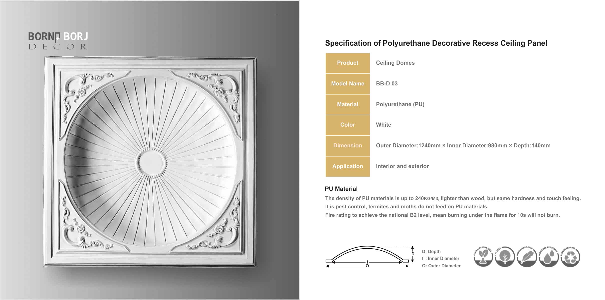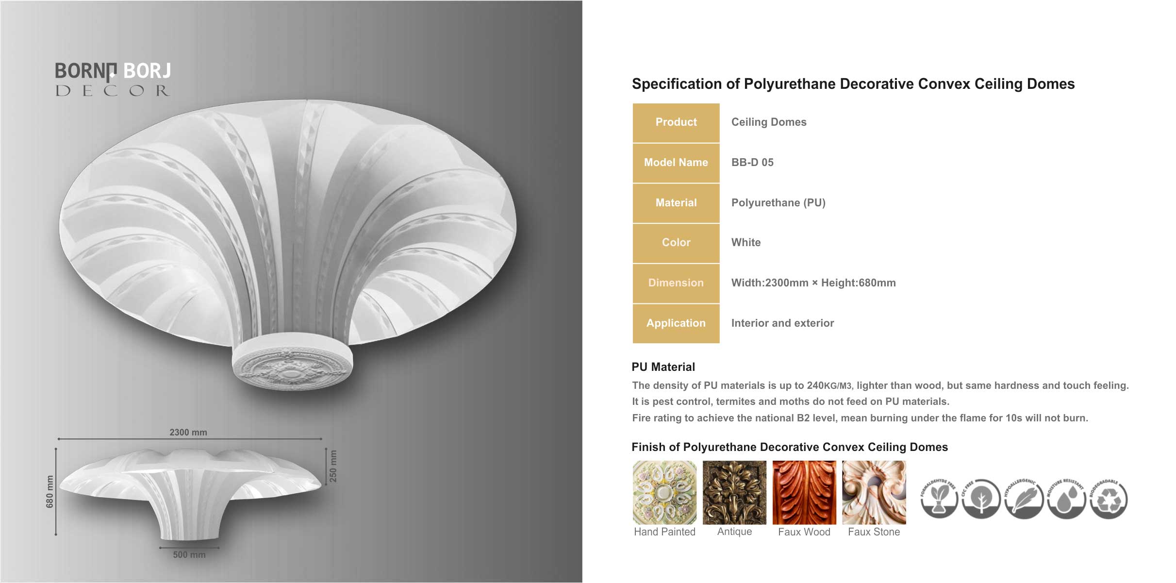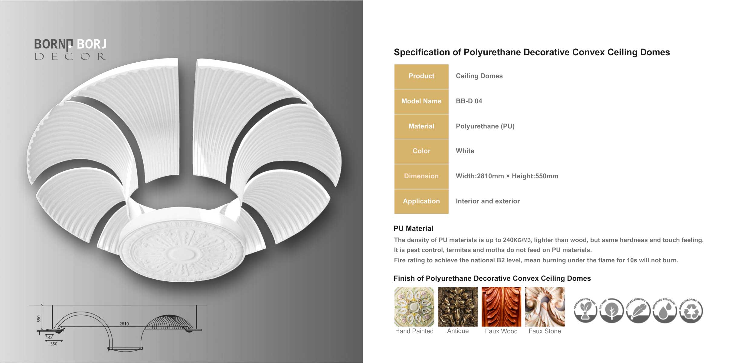 • نصب سریع و تمیز و آسان با کمترین پرت از جمله ویژگی گنبد سقفی پلی یورتان می باشد. برای نصب گنبد آماده پیش ساخته از چسب مخصوص پلی یورتان PU رنگ سفید به همراه میخ بادی برقی استفاده می شود.